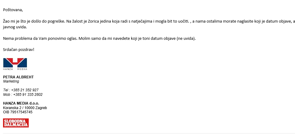 U prilogu navedeni mail redakcije Slobodne Dalmacije